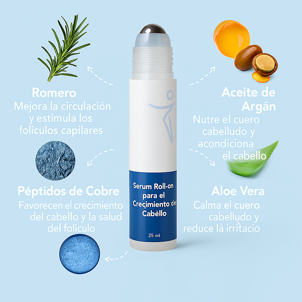 Además, nuestro aplicador en roll-on específico aplica péptidos concentrados de romero y cobre exactamente donde los necesitas (sienes, coronilla, raya), sin aceites que gotean por todas partes o se diluyen.